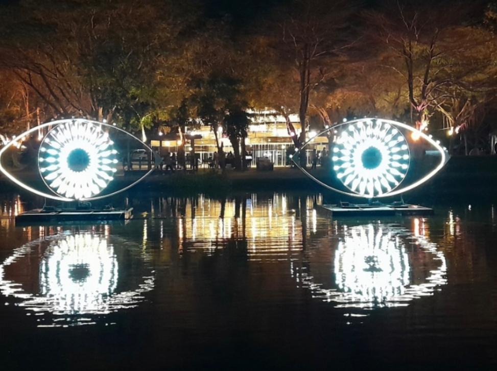 Hal itu terlihat pada karya pertama yang dimunculkan di area pertama. Begitu memasuki area festival, pengunjung langsung disambut dengan instalasi lampu berbentuk dua bola mata tiga dimensi di tengah perairan. Bola mata akan terus menatap pengunjung dari berbagai posisi pengunjung melalui pencahayaan tersebut.