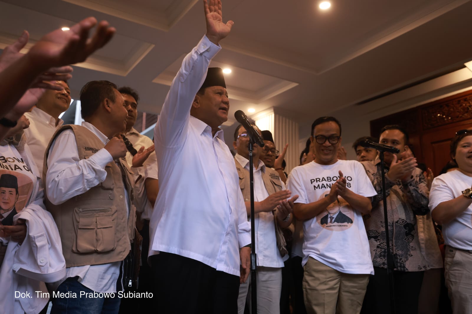 “Saya kedatangan rombongan yang dipimpin oleh Immanuel Ebenezer dengan relawannya dari seluruh Indonesia. Dan mereka tiba-tiba buka baju, dalamnya bikin kejutan ke saya. Prabowo Mania 08,” ujar Prabowo.